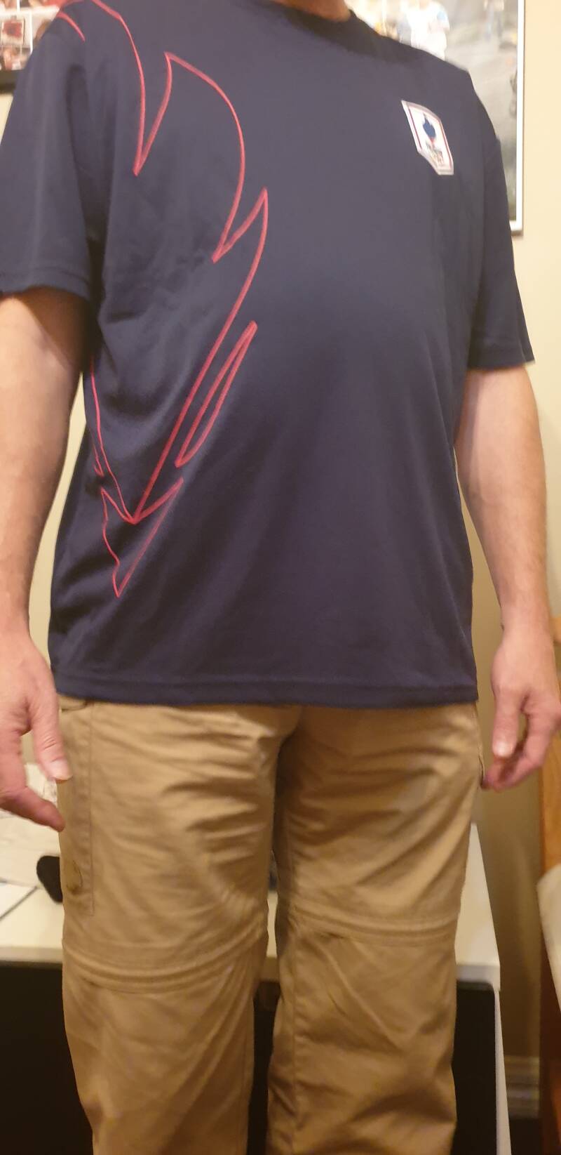 Mijn vrouw was ondertussen uit haar werkkamer naar beneden gekomen omdat zij waarschijnlijk de meerdere kleine vreugde kreten en het zachte gekreun had gehoord en zich terecht afvroeg wat er toch allemaal gebeurde. Ik was onder het toeziend oog van haar begonnen aan het uitpakken van het pakketje. Als een soort prachtige lingerie werd de verpakking behandeld en heel voorzichtig, beetje bij beetje, met gevoel en met enige nerveuziteit werd er steeds meer zichtbaar. “You never touch me like that anymore.” zei iemand zachtjes op de achtergrond met een beetje teleurstelling in haar stem, maar ik had daar nu eventjes geen tijd voor. Uit de verpakking kwam een T-shirt die nog verpakt was in het plastic. Mijn vrouw zag aan mij gezicht dat ik verrast was, misschien wel iets teleurgesteld, aangezien het geen groen-wit T-shirt bleek te zijn maar een donkerblauw T-shirt. Het bekijken van de achterkant was op zich niet zo bijzonder, maar toen ik het T-shirt omdraaide werd het mij duidelijk en kwamen er tranen van blijdschap. Het bleek een T-shirt te zijn van het France Olympic Team. Wat een kado! Mijn vrouw keek de situatie eens aan, begreep er duidelijk niets van en vroeg zich hardop af of het nou nodig was om hier om te huilen. Van iemand die niets maar dan ook helemaal niets met sport heeft snap ik zo iets wel, maar ik wist wel beter. Wat een blijdschap! Er zijn in mijn leven maar een aantal t-shirt bijzonder, waarvan het Olympisch volleybal wedstrijdshirt 1996, het Feyenoord Gouden Gids wedstrijd shirt 1984, het Chicago Bull T-shirt met nummer 23, mijn ondertussen verkleurde t-shirts van Sydney 2000 ( zowel de lange mouw als de korte mouw versie) het Coen Moulijn Feyenoord shirt 1970, het Olympic Torch T-shirt 2004, het Nederlandse Paralympische poloshirt 2008 en het wielrenshirt van Ti-Raleigh 1980 er een paar van zijn, maar dit T-shirt van het France olympic team behoord zeker in het rijtje favorieten.