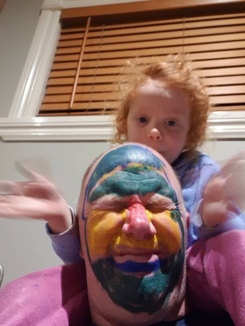 " Papa, je bent een giraf die als clown gesminkt is!" Daar moet je het dan mee doen. Ik begrijp nu wel beter dat ze blij is met het resultaat.