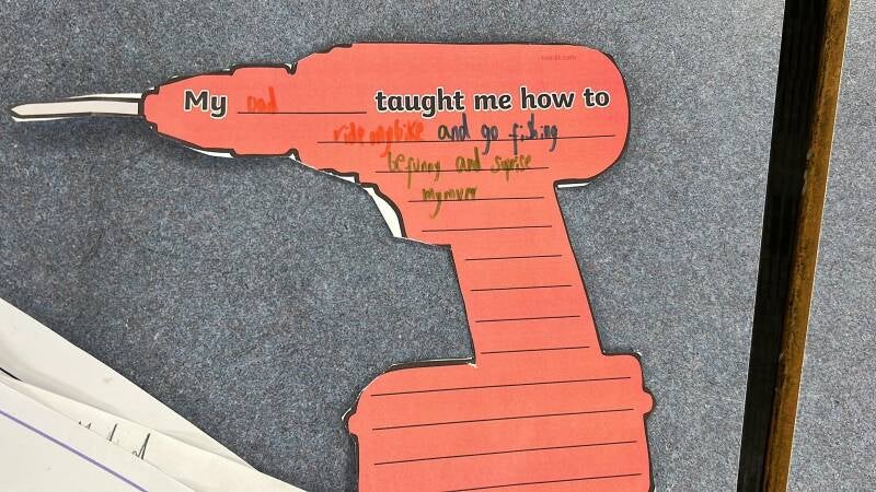 Na de korte kerkdienst werd de klas bezocht en liet Emma zien wat ze allemaal gemaakt had voor vaderdag. Er kwam een papieren gereedschapkist tevoorschijn en op de verschillende gereedschap artikelen stonden teksten.