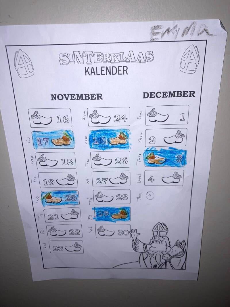 “En ik heb de schoenvulkalender ook bij de voordeur opgehangen. Kunnen ze gelijk zien wanneer ze weer langs moeten komen.” Vooral papa en mama zijn hier blij mee. Niet meer dan vier keer had Papa gezegd, dus vijf keer invullen is een risicootje nemen, maar we gaan het zien hoe coulant Sinterklaas en de Pieten zijn.